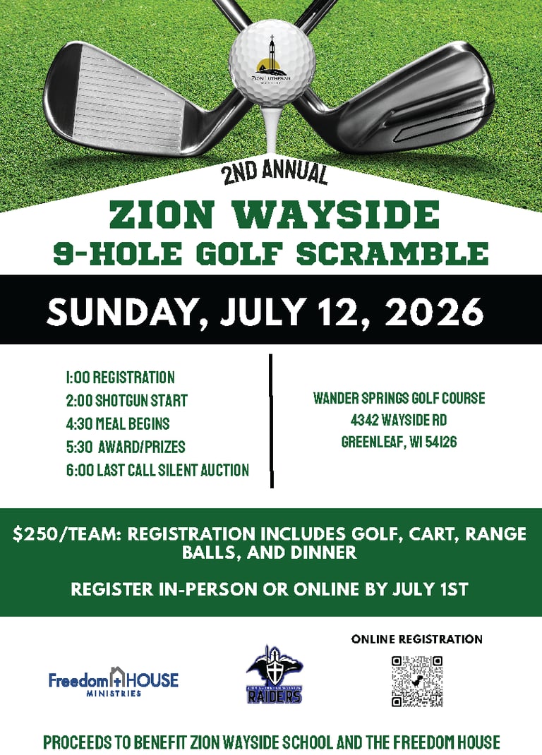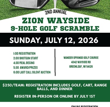Join us for our 2nd Annual Zion Wayside 9-hole Golf Scramble to support our school and its mission in Equipping Generations for Life in Christ!